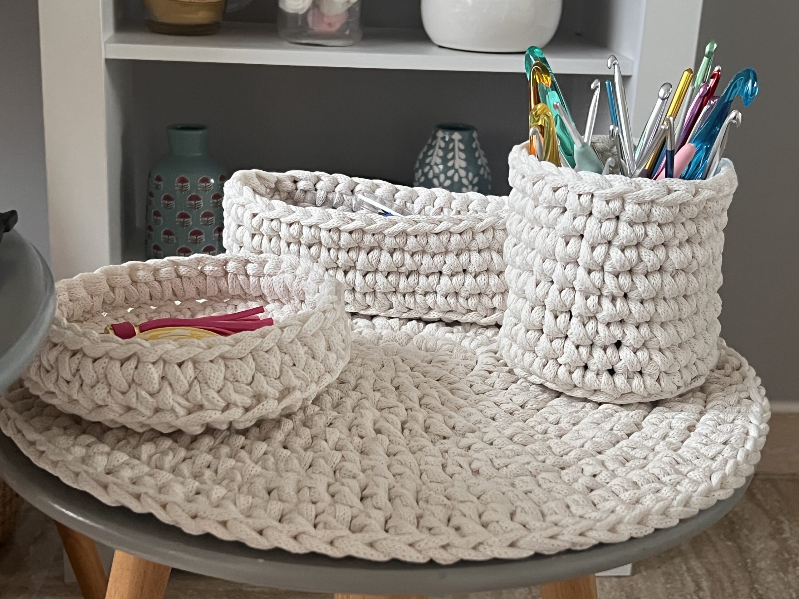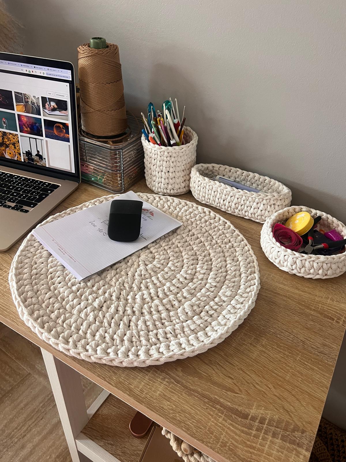 Je Crochète chaque élément dans mon atelier du Sud de la France. J’utilise un cordon de coton premium pour garantir tenue, toucher doux et entretien simple. Le set fonctionne au bureau, dans l’atelier créatif ou sur une console d’entrée ; tu gardes une esthétique naturelle, sans renoncer à l’efficacité.
