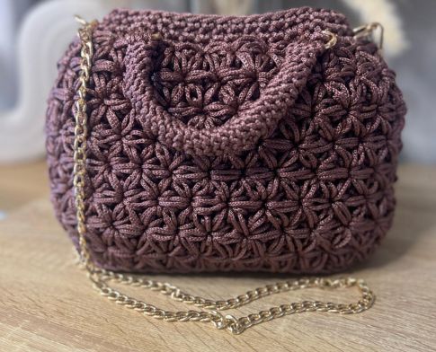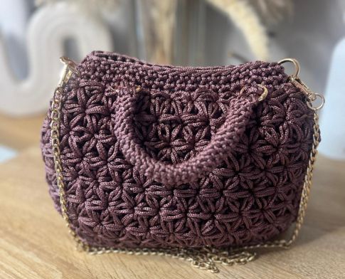 Chaque détail a son importance. Le crochet, travaillé à la main, révèle le savoir-faire artisanal. Ici, j’ai utilisé le point jasmin qui est un point décoratif qui ressemble à des étoiles ou des fleurs et donner cette structure au sac. j’utilise ici du fil polyester qui donne cet aspect satiné. les anses sont crochetées et les anneaux dorés ajoutent une touche moderne et lumineuse. C’est cet équilibre entre authenticité et élégance qui fait de ce sac une création unique.